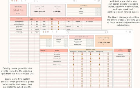 Connect the dots between your main guest list and related events. Mark invitations sent, track attendance, and get a comprehensive count. Easy peasy!